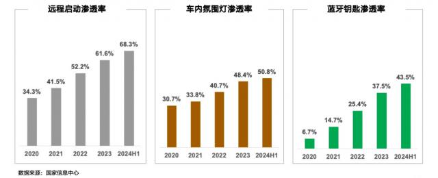 在早期阶段,远程启动是一项比较困难的技术,现在渗透率已达到 车内气氛灯68%的渗透率 蓝牙钥匙50.8% 43.5%。