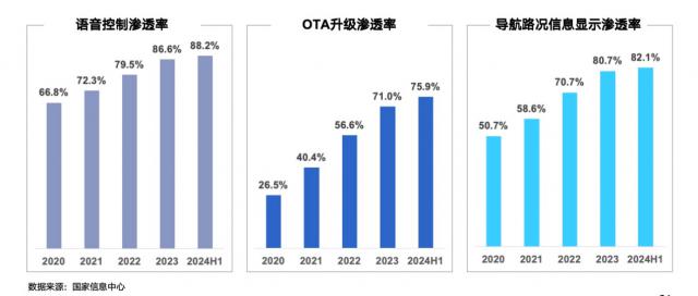 驾驶舱发展更加迅速,OTA 升级渗透率 导航实时路况显示渗透率75.9% 语音控制渗透率已发展到82%。 88% 程度。现在,市场上只剩下一些没有语音功能的豪车和低端车型,现在可能没有语音控制的汽车将面临销售困难。