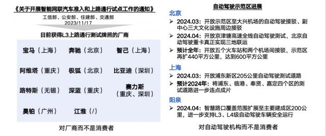 就政策而言,国内部分已开放。 L3/L4 商品准入和上路试点。首先是厂家测试,基本上厂家会提供牌照。比如北京给奔驰和极狐放牌照,可以测试一下。 L3 上海是宝马和智己,深圳给比亚迪,重庆给赛力斯和深蓝,广州给广汽的昊铂等等。
