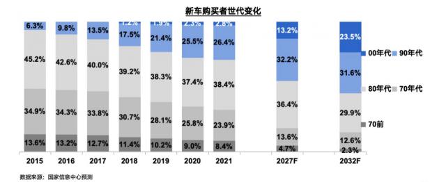 95 后期的人群将成为未来汽车购买市场的主体,这一比例将逐步上升。有望 2032 年,00 之后会占用买车人群 23.5%,90 后占 31.6%。简单地计算这些数据,直到 2032 年,每 100 在一位购车者中,约有 40 人将是 95 后。