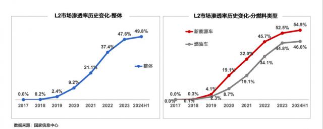 目前智能化的发展主要集中在智能驾驶和智能驾驶两个方向。在智能驾驶方面,从数据来看,2023年 年至 2024 L2年上半年 整体市场渗透率已达到 新能源汽车市场渗透率接近49.8% 55%,油车 46%。