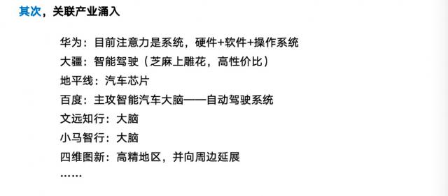同时,汽车产业链的上游供应商也在迅速发展。现在华为的软件、硬件、操作系统都有很强的实力,但是数据和特斯拉还是有一点差距的。DJI做智能驾驶。它们的特点是芝麻雕刻,性价比高,使用方便。 50% 打造 90% 性能;还有地平线在做智能驾驶芯片,下一步就是做智能舱芯片;百度、文远知行、小马智行、四维图新等企业发展迅速,产业链非常丰富。这样才能有效地促进汽车工业的发展。