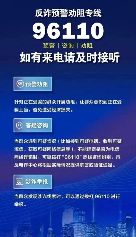 96110是国家反诈骗预警专线。它专门用于电信诈骗预警说服,防止你和你的家人遭受经济损失。