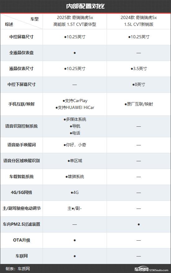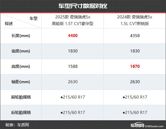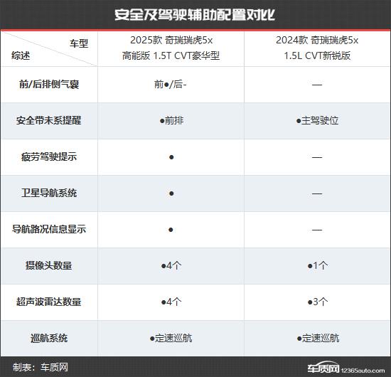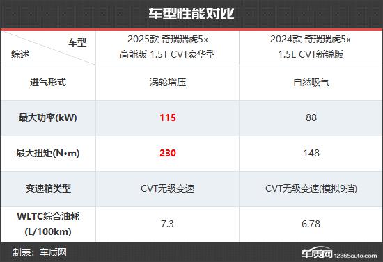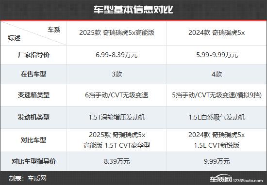 2025 款奇瑞瑞虎 5x 高能版(以下简称:瑞虎 5x 共推出高能版) 3 汽车,价格区间 6.99-8.39 万元。与老款车型相比,起步价有所提高,顶配车型的售价也有所下降。为直观对比,我们选择 2025 款奇瑞瑞虎 5x 高能版 1.5T CVT 豪华版和 2024 款奇瑞瑞虎 5x 1.5L CVT 对比前沿版本,以便更直观地看到新旧车型的实际变化。(因为现在照片数量较少,所以老款车型的一些照片并不是相应的具体款式)