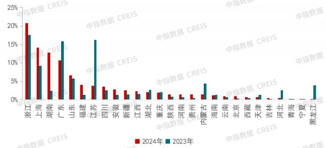 2024 2008年,通过对全国房地产招标数据的监控和分析,浙江省、上海市和湖南省发布的信息数量最多,其中浙江省占比超过 上海市和湖南省的比例分别为20.8%。 14.2% 和 12.8%。与 2023 2008年,这三个省份的比例都有所提高。虽然广东省占比超过 10%,但相较 2023 年份比例明显下降。江苏省、内蒙古、河北省、黑龙江省等省份也大幅下滑。