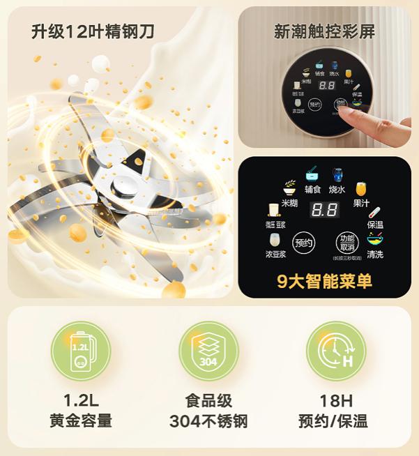 ✅ 9 大功能(浓豆浆) / 微压豆浆 / 米糊 / 辅食 / 烧水 / 果汁 /18H 保温 / 一键清洗 /18H 预约)