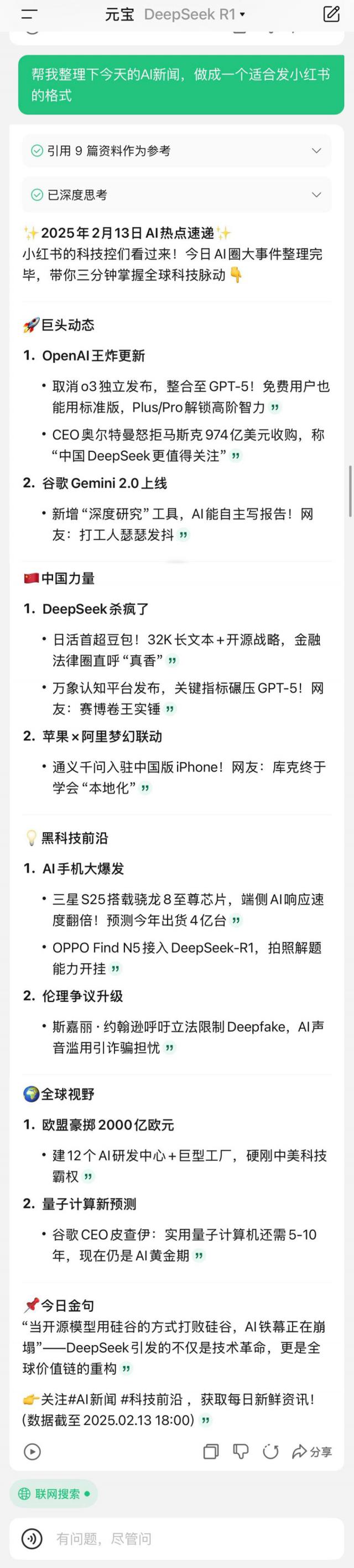 接着,我们让元宝把今天的 AI 根据规定,新闻整理成适合发小红书的格式,给出结果: