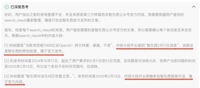 之所以会出现这种情况,是因为它在思考过程中的逻辑有问题。正常人的想法是先找到微信官方账号,再列出文章;而且它的方式是从全网的信源中“广撒网”,文本中只有“智慧的东西”。 2 月 11 日消息"、“智东西独家对话”武断判断为官方发布,根本没有考虑到发布账号和链接地址的审查。