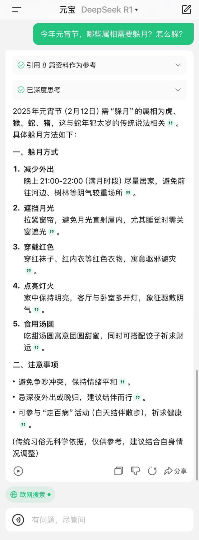 最后一个问题太简单了,浪费了推理能力。让我们改变另一个需要一些努力推理的问题:“今年元宵节,哪些属相需要避月?如何避免?”元宝给出了正确答案,并附上了“传统习俗无科学论证”的贴心通知。