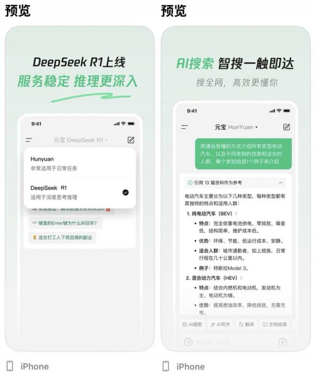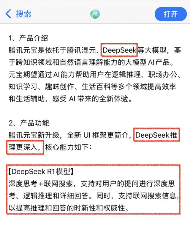 从应用介绍页面可以看出,腾讯元宝已将 DeepSeek R1 作为吸引下载量的一流观点:
