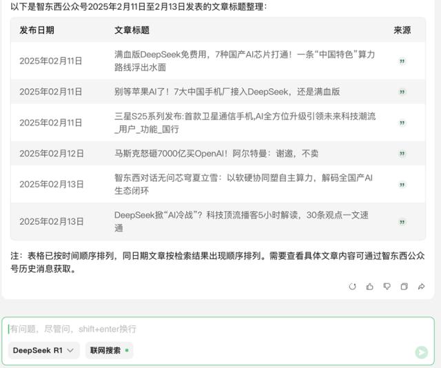 元宝也有翻车的情况。比如我让元宝把智东西微信官方账号。 2 月 11 日到 2 月 13 每天发表的文章标题整理成表格,其表现不及格。输出结果不全,几篇文章的发布日期和标题都不是原来的标题。点击来源搜索后发现借鉴了其他第三方账号的转载和修改结果。