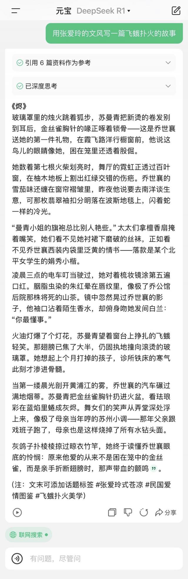 也许做小红书的设计还需要做一些探索和调试。让我们换一个写作测试,让元宝用张爱玲的风格写一个飞蛾扑火的故事。