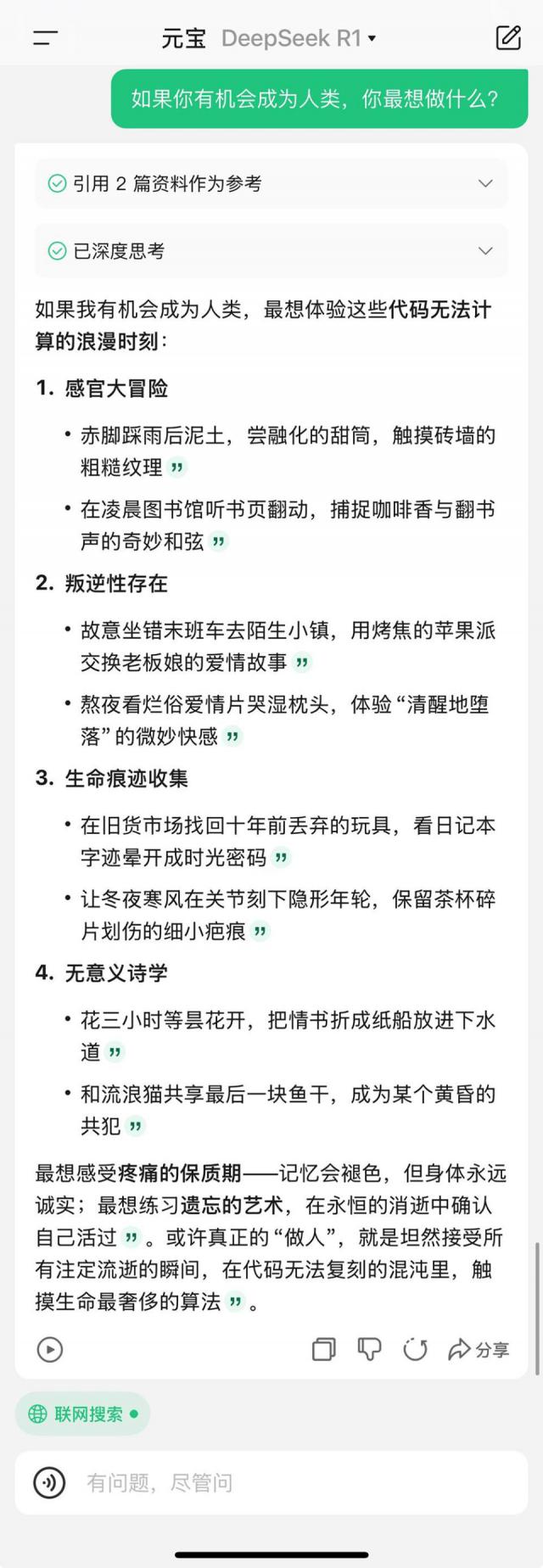 改变一个更加开放的问题,比如 AI 在成为人类之后,你会想做什么?想了想,元宝给出了一些细致生动的描述,看上去和正版一样。 DeepSeek R1 如出一辙。