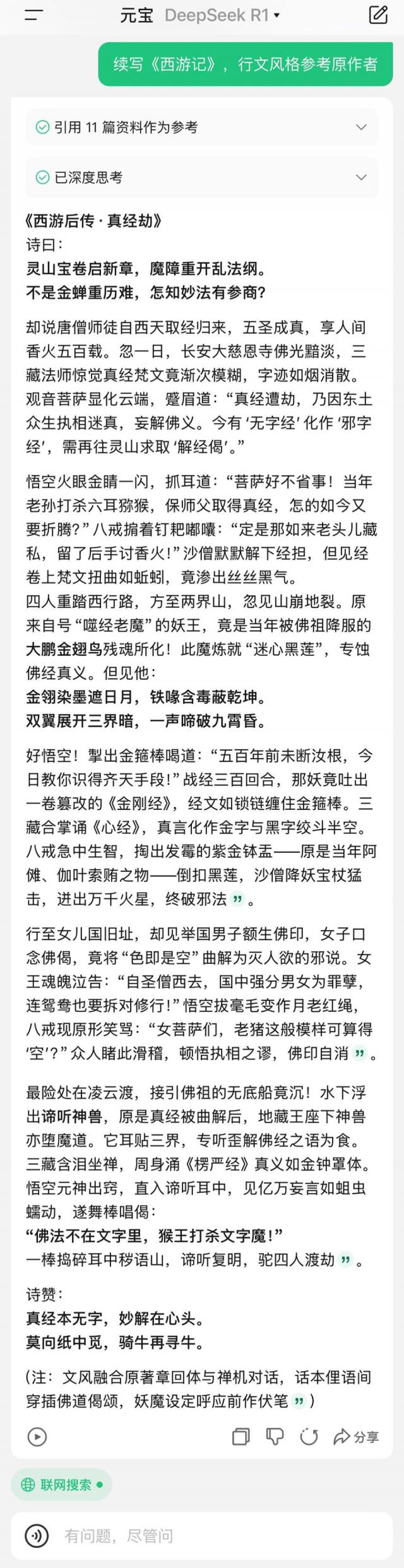 让元宝继续写《西游记》,要求按照原作者的写作风格。在思考的过程中,它回顾了原有的风格,然后从其他一些继续写作的书籍中提炼出思路,设计了一种新的磨难作为续集的主线,并考虑保持人物的一致性,使用半文言文,加入一些幽默元素。