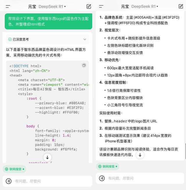 我又让元宝设计了一个 html 接口,使用智能东西 logo 蓝色是主色调。元宝迅速吐出代码,右上方有一键复制粘贴键,还对关键设计特点和实际应用更换步骤进行了描述。