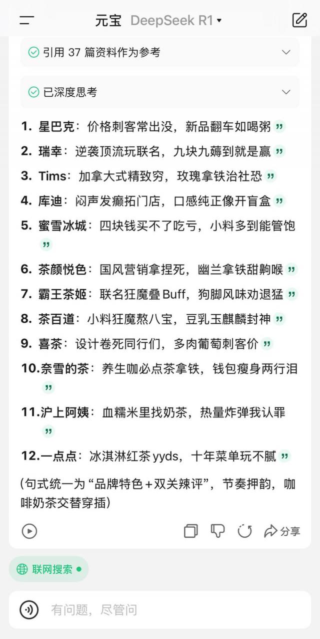 换成奶茶和咖啡品牌的评价更接近日常生活,它的答案也很像样: