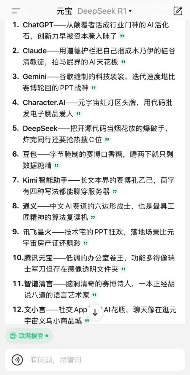 再次调查一下更难的信息汇总和分析能力,让元宝一句话辣评 12 个 AI 社交软件。经过大量的分析和思考,元宝给出了一系列刻薄的评价,信息来源仍然附在每个句子的最后。点击绿色逗号即可找到参考文章。