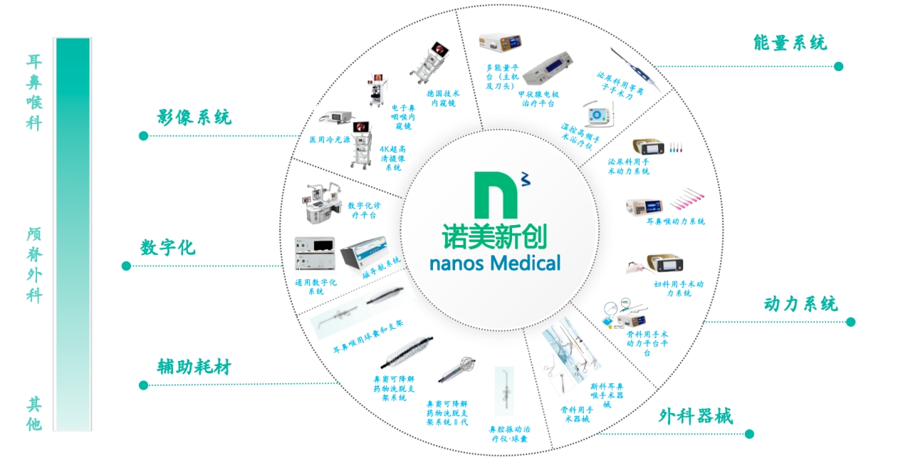 利用这些并购整合动作,诺美新创成功搭建了中国耳鼻喉科和颅脊外科设备平台。目前,公司的核心产品包括低温等离子手术系统、动力装置、医用内窥镜拍摄系统、高频温度控制手术理疗仪、咽鼓管球囊扩张导管、鼻窦球囊、鼻咽通气管一次性使用、鼻窦药洗脱支架、手术器械等。