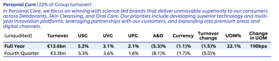 联合利华个人护理业务较去年同期下降1.5%,与美容健康业务、家庭护理业务相比,有所增长。
