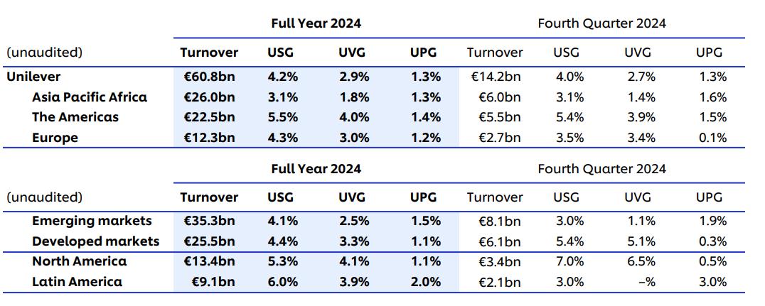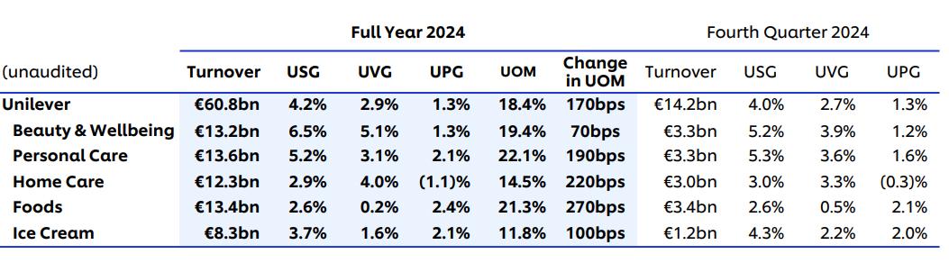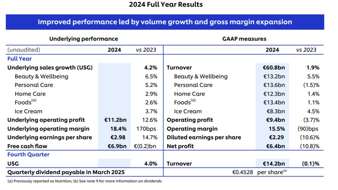 可以看出,联合利华在2024年全年业绩上大致呈上升趋势。另外,此次财务报告还有以下关键数据值得关注: