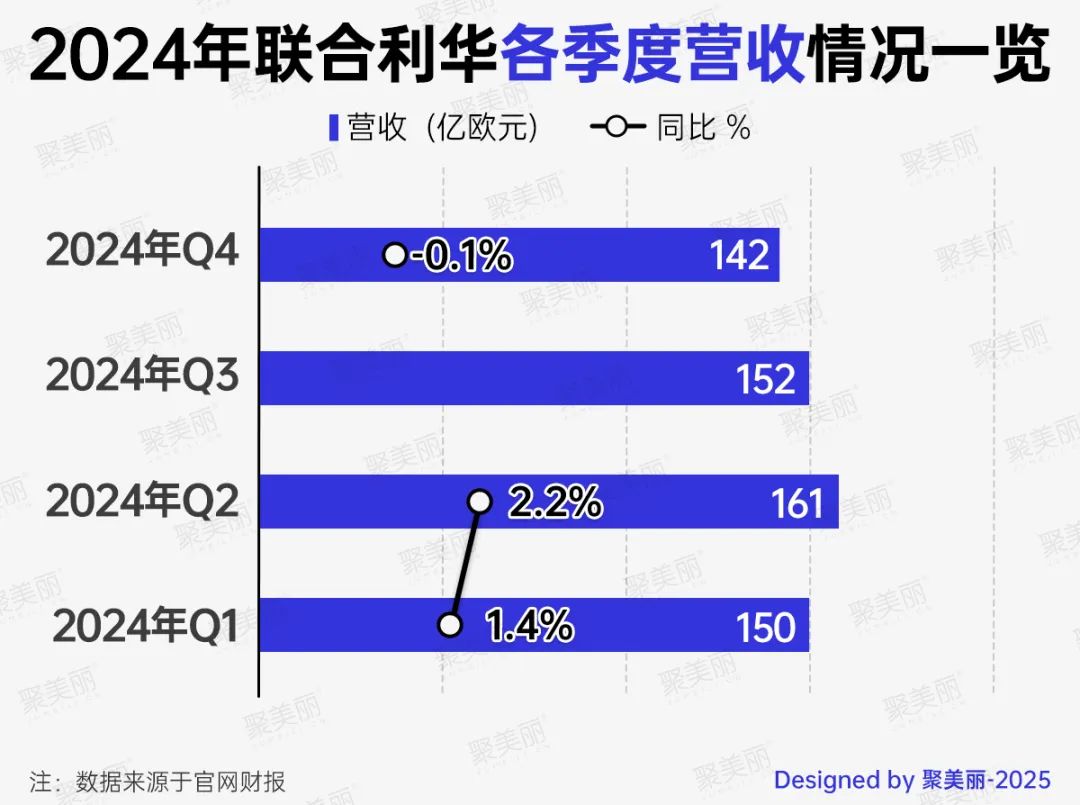 纵观联合利华2024年各季度营收数据,不难看出,继2024年Q1-Q2营收较同期有个位增长之后,2024年Q3与去年同期大致持平,Q4同比下降0.1%。