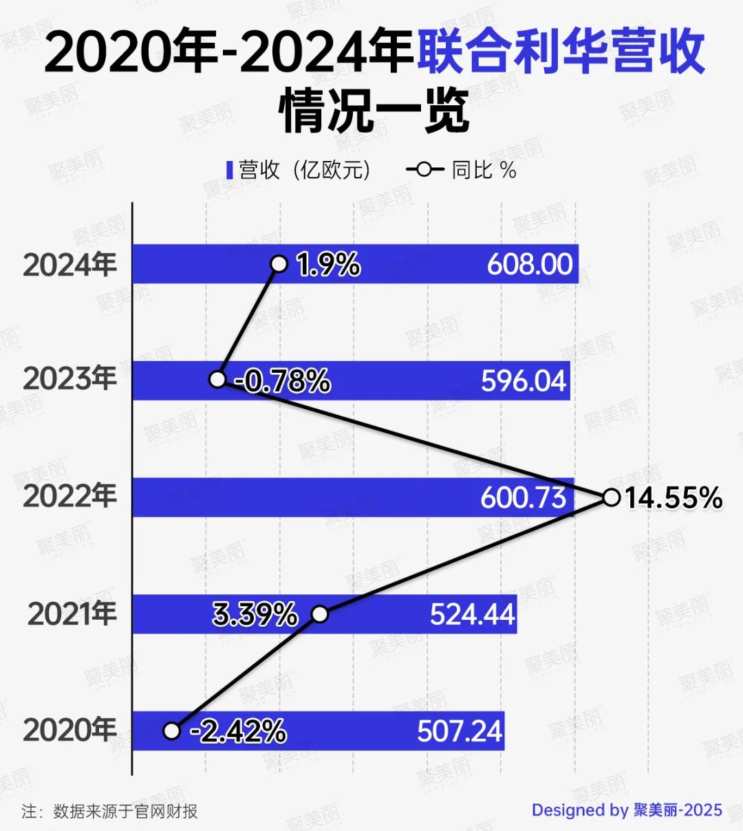 聚焦本文提到的联合利华,从其近五年的业务表现可以看出,除2020年和2023年外,其营收同比下降2.42%。、除0.78%外,其它年份均有所增长,其中,2024年营收最高,也是继2022年之后,再次突破600亿欧元(约4558亿元人民币)。
