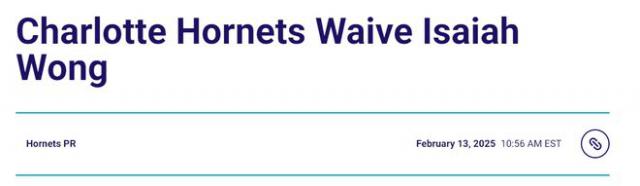 北京时间 2 月 14 夏洛特黄蜂官方宣布,球队已裁掉双向合同球员赛亚。 - 王。以赛亚 - 在采访中,王曾自称是华裔,并表示愿意为中国男篮效力。