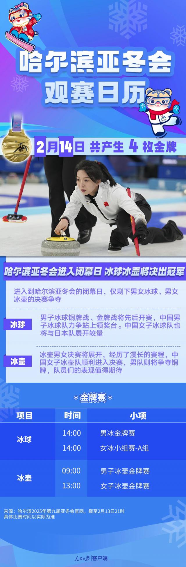 哈尔滨亚冬会 14 这一天将进入最后一个比赛日,冰球、冰壶两个项目将获得四枚金牌,中国代表团有望冲击单个代表团单届亚冬会金牌数的历史记录。另外,充满看点、充满悬念的闭幕会议也会吸引全亚洲的目光。