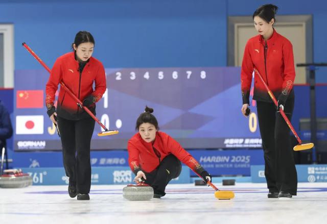 2 月 13 第二天,中国球员在球场上。当天,第九届亚冬会冰壶女半决赛在哈尔滨举行。新华社记者 胡星宇 摄