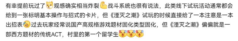 值得一提的是,在作者关注的游戏博主中,一些博主有幸提前线下体验到了《湮灭之潮》的内容,其中提到游戏厂商在参与线下试玩时,一般会给出一张标有基本操作和招式的卡片,但《湮灭之潮》却给出了一份完整的招式表。