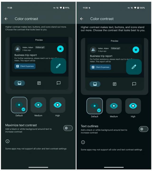 “最大化文本对比度”在设置中增加了“文本轮廓”选项。