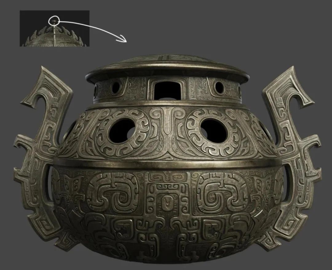 无论大鼎以什么形式出现,都具有商朝青铜鼎的图案特征。小鼎的整体造型参考了龙纹扁足鼎的腹部和柱脚设计。