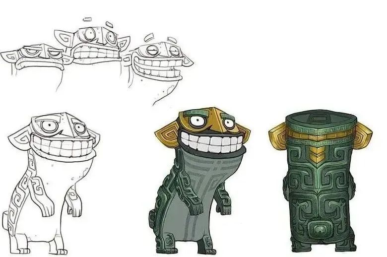 卷鼻结界兽的形象融合了青铜面具、黄铜鹰形铃等多种元素。最明显的表现就是它卷曲的鼻子和黄铜鹰形铃的嘴型非常相似。