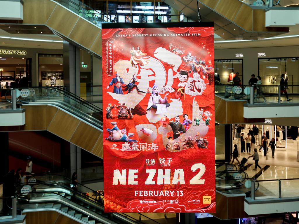 这张巨大的海报是2月13日在澳大利亚悉尼一商场拍摄的《哪吒魔童闹海》。新华社记者 马平 摄