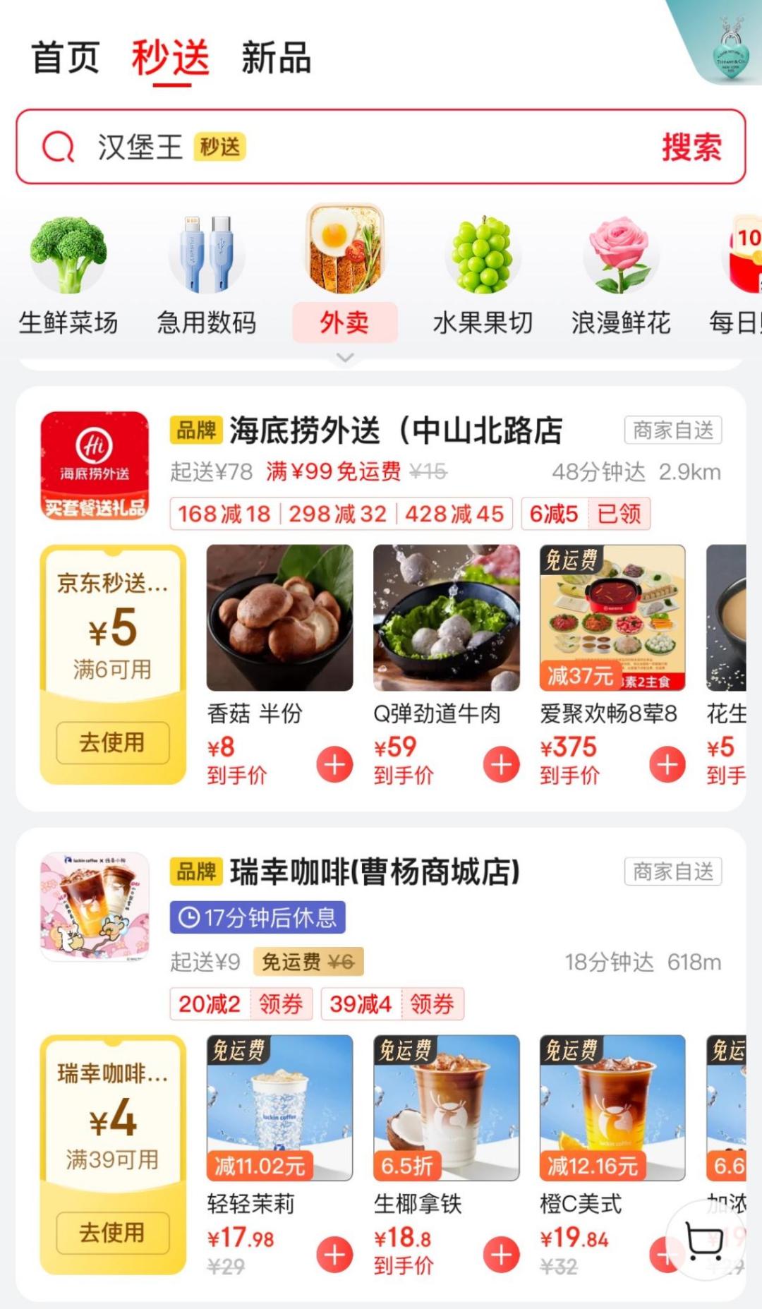 现在开启京东APP「秒送」-「外卖」在页面上,我们可以看到除了之前的咖啡奶茶和汉堡快餐品牌之外,还有大米先生、袁记饺子、海底捞、左庭右院等正餐品牌。,而且几乎每个家庭都有6元减5元的优惠券。但由于还处于起步阶段,目前整体供应量还比较少。