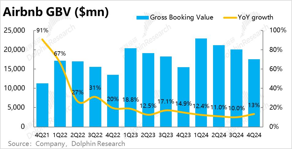 核心业务指标-Airbnb的总预订金额(GBV)这个季节达到175.5亿美元,同比增长13.4%,整整3.4比上季度加速。pct,明显高于市场预期的11%。这一信号的关键意义在于,市场对Airbnb最大的担忧之一是预订增长持续放缓,甚至有滑向个位增长的危险。这次的表现可能意味着公司进入了一个信号灯,至少不会继续下降。