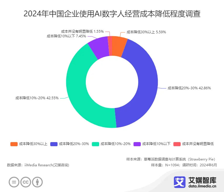 根据艾媒咨询数据,42.86%的企业表示,使用AI数字人后,运营成本下降了20%-30%,42.55%的企业表示运营成本下降了10%-20%。