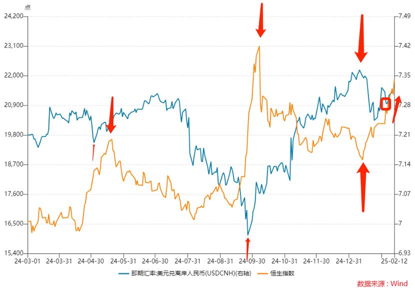 1)由于DeepSeek的成功,对中国资产持积极态度,此时开始发挥作用,并以港股通为重要渠道,因为后者是通过“在岸市场”将人民币兑换成港元,对离岸人民币汇率影响不大;