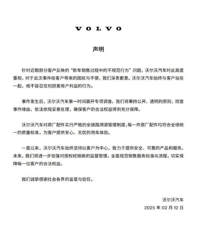 沃尔沃道歉 彻底调查原因,并依法依规处理。