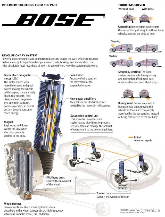 当时, BOSE 利用电磁主动降噪的原理,制作出一套以线性电磁电机为主的电磁悬架。
