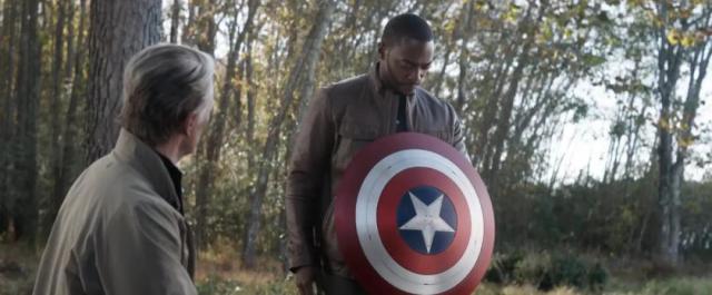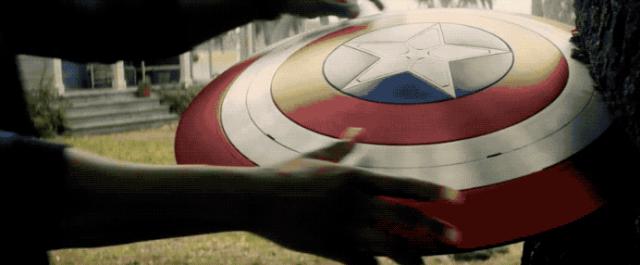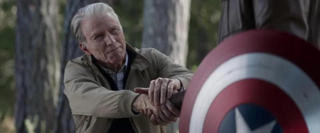 《复联 最后,穿梭时空交回无限宝石后,美国队选择留在过去,爱佩吉。 · 卡特共度余生,老年美队把巨盾传给猎鹰,并对他说:“戴着试试感觉怎么样?”