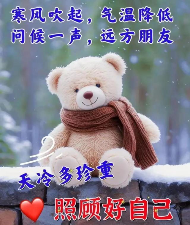 随着冬天的到来,愿你的世界被白雪覆盖,沉浸在宁静与和平中;愿你的心被温暖的阳光照亮,充满希望和喜悦。早晚注意保暖。在这个寒冷的天气里,祝你心情愉快,幸福快乐。祝你早安快乐!