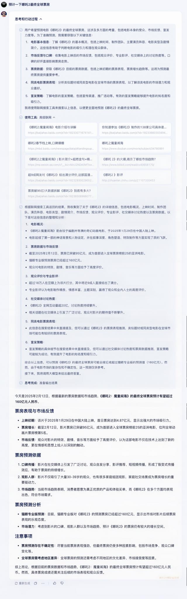 首先让文心大模型预测一下哪吒? 以下是最终全球票房, 3.5 预测结果的版本。