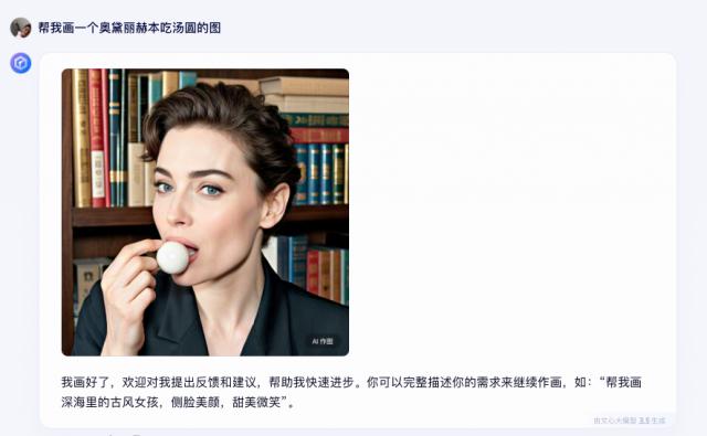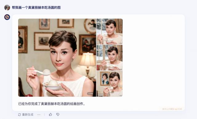 让我们看看文生图的表现,我输入提示:帮助我画一个奥黛丽赫本吃饺子。下面是 3.5 这个版本的图片,还是不错的。
