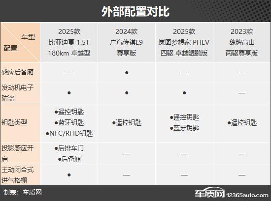 在外部配置方面,比亚迪夏在四款车中表现相对较好,独享后排车门 / 后备箱投射感应开启并主动关闭进气格栅,并提供多种钥匙类型,日常使用非常方便。相比之下,魏牌山在外部配置上表现一般,存在一定的缺失。