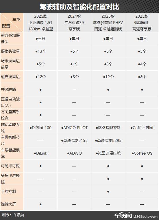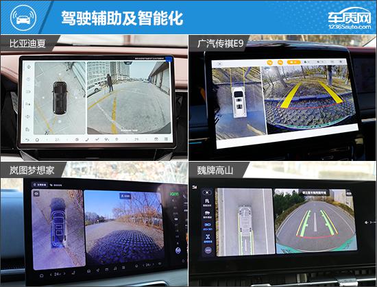 在驾驶辅助配置方面,比亚迪夏的表现最为出色,不仅配备了三个目前的感知摄像头,还配备了三个目前的感知摄像头。 13 一个摄像头,是四款车中数量最多的;与此同时,它还支持匝道自动离开 ( 入 ) 、方向盘离手检查等,智驾能力有目共睹。而且传祺 E9 驾驶辅助功能方面的表现比较一般,装备缺失较多。