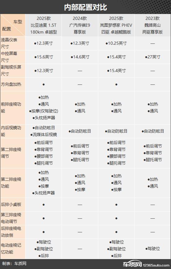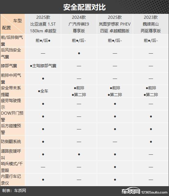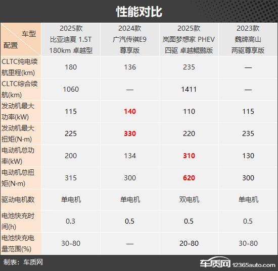 通过对比不难看出,比亚迪夏在这次推荐的四款车中综合优势最为明显。传祺 E9 与梦想家的表现相当。前者在发动机性能上保持领先,后者在智能配置上表现良好。魏牌高山整体表现略弱,但也达到了同级中上游水平。总的来说,这次推荐的四款车都能满足家庭的需求。如何选择取决于你的个人爱好。