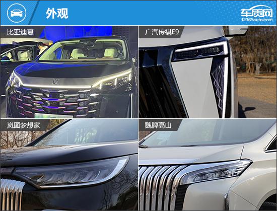 在外观上,四款车都采用了各自家族式的设计语言。比亚迪夏的设计灵感来源于“中国传统文化”。龙鳞盔甲元素辅以车前大尺寸前格栅内饰,搭配“龙须”饰条,营造出相当到位的时尚感。传祺 E9 设计更简单,大灯和车前一起组成。" X "形状,气场非常强大。梦想家更注重创造奢华感,银色中网组合贯穿式 LED 灯带,让整车更有质感。用干净利落的线条勾勒出魏牌高山的正面,则营造出更加威武端庄的视觉效果。