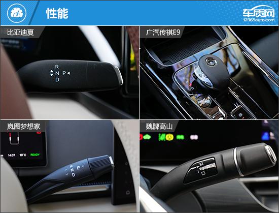 动力方面,传祺 E9 最大功率的发动机 最大扭矩140kW 330N · m,保持四款车的领先地位。梦想家是唯一一款配备双电机的车型,电机总功率 总扭距310kW 620N · m。电池寿命方面,梦想家 CTLC 达到综合续航里程 1411km。在补能方面,比亚迪夏的快充时间最短,电量从 30% 充至 80% 只需 0.3h。在换挡方式方面,除了传祺 E9 除了电子挡把换挡之外,其它三款车型都是电子怀挡换挡。