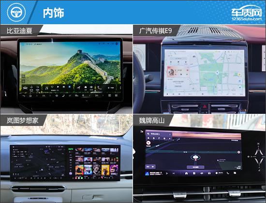 在内饰方面,四款车都采用了“ T "字形布局。在这些屏幕中,比亚迪夏的中控支持转动,可玩性更高。与此同时,魏牌高山的双屏由仪表盘和中控面板组成,比较常见;梦想家则是将中控面板和副驾驶娱乐面板融为一体,更具个性。另外,除了比亚迪夏和传祺 E9 除了中控台区域保留了一定数量的实体按键外,其它两款车型都进一步减少了实体按键的数量,使得车内显得更加简单。